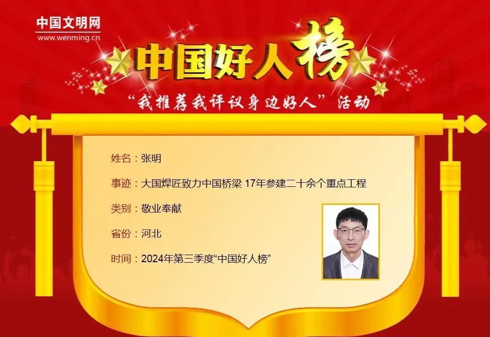 11月12日,中央精神文明建設(shè)辦公室主辦的2024年第三季度“中國好人榜”公布,中鐵山橋焊接特級(jí)技師張明入選2024年第三季度敬業(yè)奉獻(xiàn)“中國好人榜”榜單。